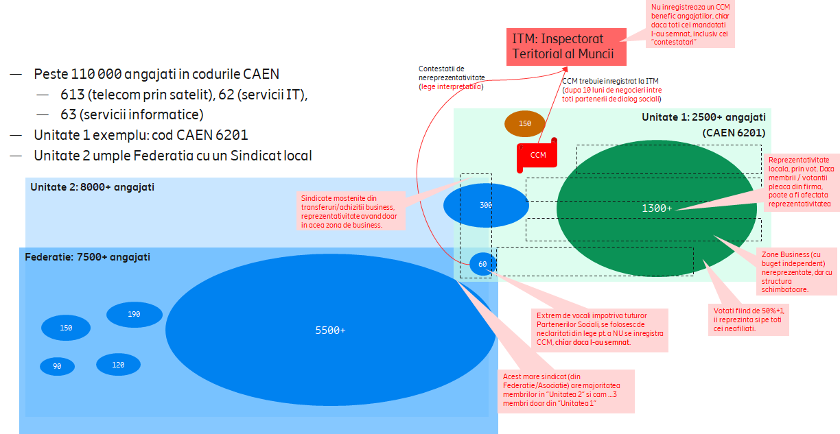 - RS reprezinta 50% +1, si mai sunt o gramada de sindicate liliputane nereprezentative local, dar, este si un singur sindicat liliputan (~60 membri locali, din cei ~2500 salariati) care s-a alipit la o federatie de sector, ce si-a luat/rezolvat reprezentativitatea undeva prin Vaslui, chiar imediat dupa inceprea negocierilor CCM, si pretinde (“conform legii”, si cu ajutor ITM) ca trebuie sa ii reprezinte pe toti 2500 angajati, plus inca vreo 6000 angajati din Bucuresti, chiar daca acestia nu vor sa fie membri la acest sindicat scandalagiu si fara noima, dar procesoman