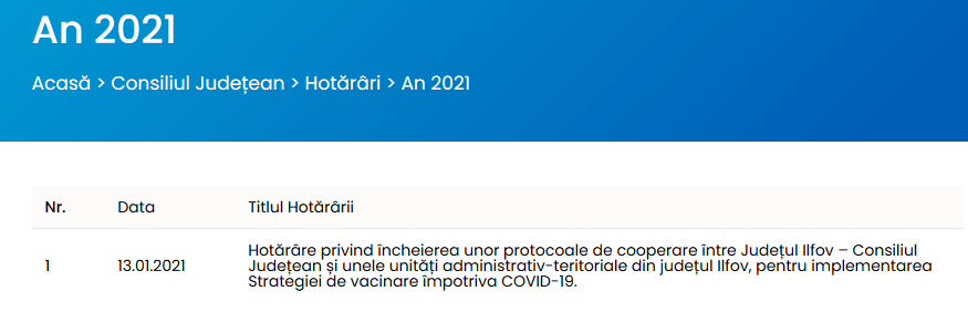 Ianuarie 13: CJI da hotararea de colaborare cu cele 22 localitati pt. dotarea acestor centre de vaccinare (Berceni este inclus)
