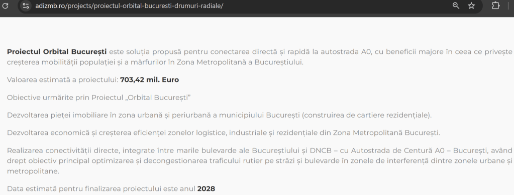 2022 Ianuarie: zice la ziar ca au aprobat …sa mai genereze niste hartii; “Adunarea Generală a Asociaţiei de Dezvoltare Intercomunitară Zona Metropolitană Bucureşti (ADIZMB) a aprobat parteneriatul cu CNAIR pentru realizarea studiilor de fezabilitate pentru cele 10 radiale care leagă Bucureştiul de autostrada de centură.“