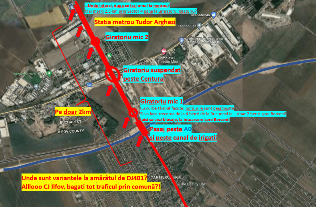 Fara astea or sa fie blocaje imense, atunci cand oamenii se intorc acasa, dupa o zi grea de munca, seara, si vor trece de la cele 2 benzi pe sens (care sunt pe soseaua Berceni si pasajul peste centura) la amărâta de banda pe sens a anticului DJ401, proiectat pt. cateva tractoare, combine agricole si tot atatea carute, nu pt. 15 000 masini pe zi !!!
